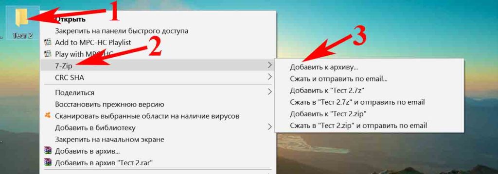 Выбираем папку с ценной для вас информацией, наводим курсор на неё, клацаем правой кнопкой мыши. Появиться список, в котором нужно найти и выбрать «Добавить в архив».