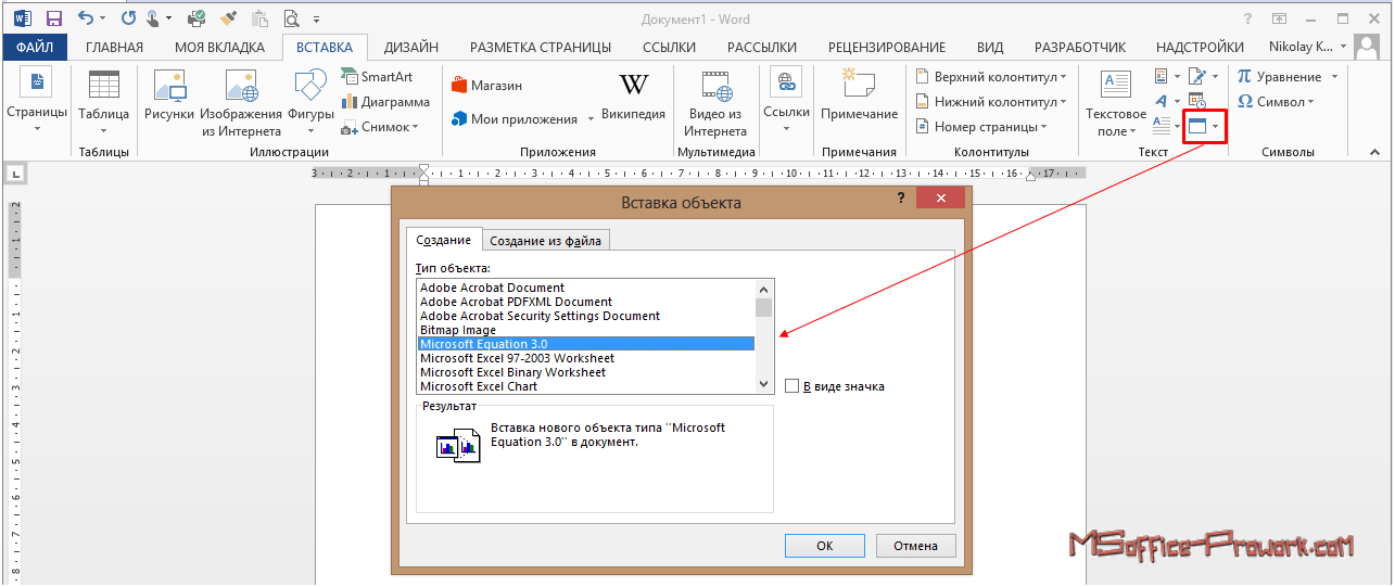 Данный способ подходит для любой из рассматриваемых версий Word (2003-2013), однако его лучше не использовать в версиях выше Word 2003, поскольку, начиная с 2007-й версии Word уже имеет встроенный редактор формул, о котором будет идти речь позже.