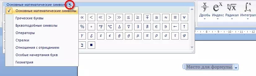 Чтобы раскрыть полный перечень и выбрать соответствующую категорию букв и знаков, нажмите сначала на стрелочку вниз, а затем на надпись “Основные математические символы”.