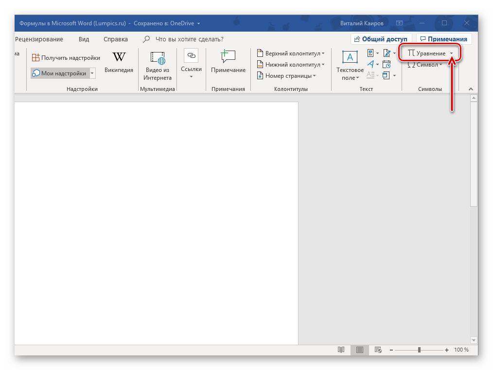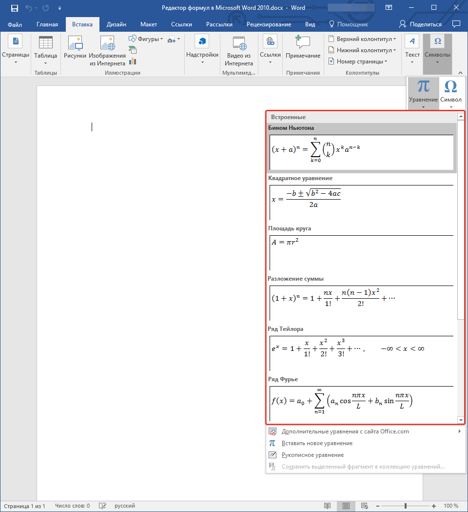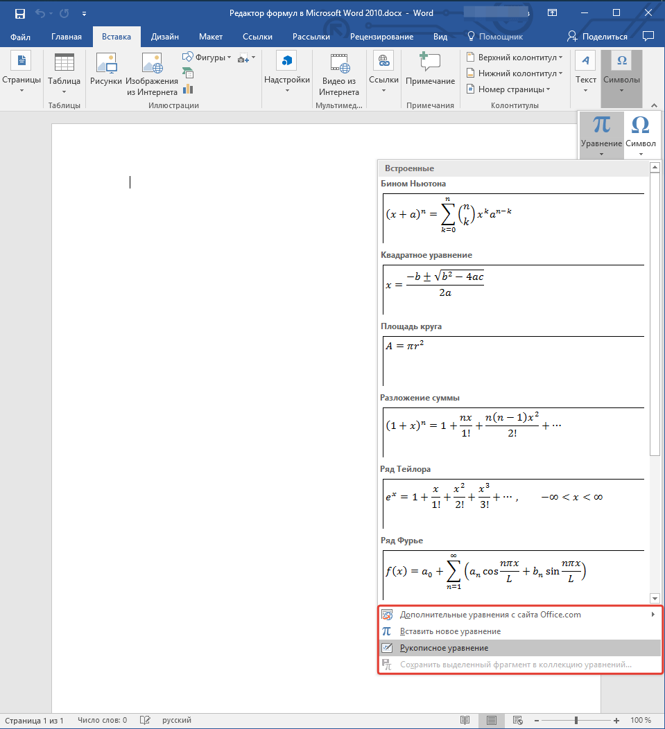 Вставка формулы в документ Word с помощью встроенного редактора формул.