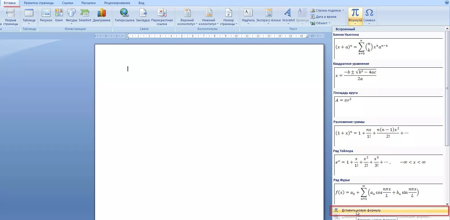 Для создания формулы используется пункт «Вставка» и подпункт «Формулы», после активации которого пользователю предлагаются наиболее распространённые варианты, такие как бином Ньютона, площадь круга и т.д. Чтобы ввести собственное выражение выберете функцию «Вставить новую формулу».