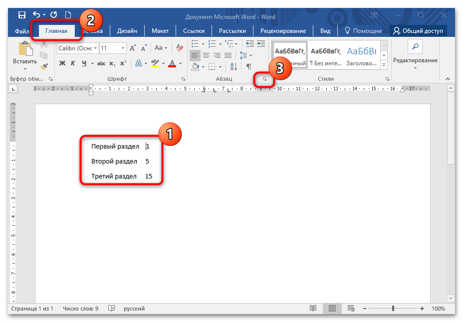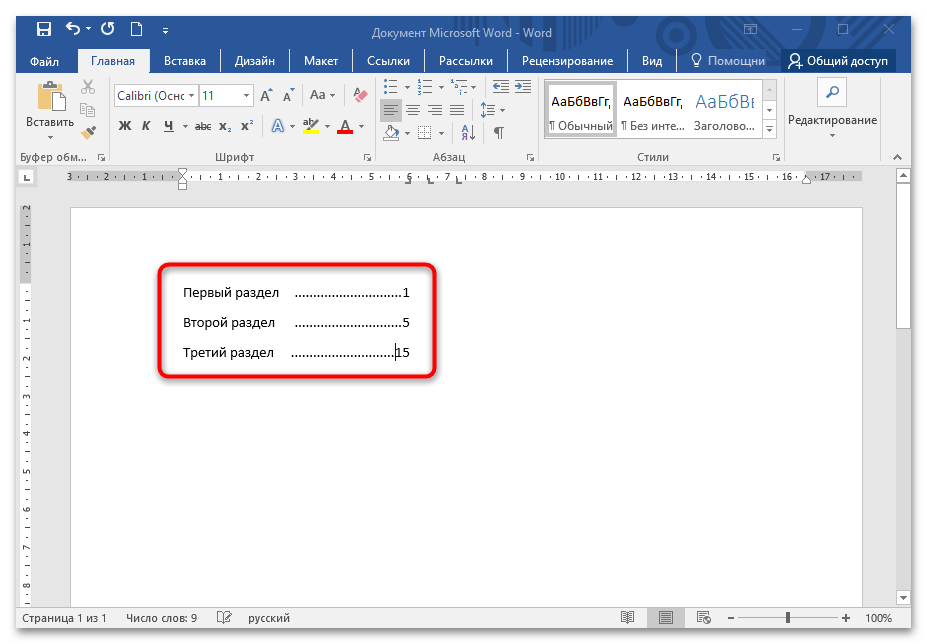 Без использования знаков табуляции для смещения вправо введите названия разделов документа и номера страниц. Если нужно их переместить правее, лучше использовать пробелы или настройки отступов и интервалов через раздел «Абзац», который находится на вкладке «Главная».