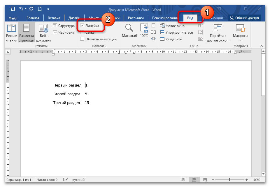 - Включите отображение линейки в документе. Сделать это можно во вкладке «Вид».
