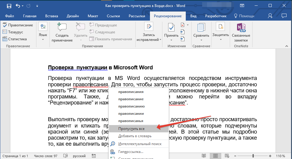 - Совет: Если вы убеждены в том, что подчеркнутое слово написано правильно, выберите в контекстном меню команду “Пропустить” или “Пропустить все”. Если же вы хотите, чтобы Ворд больше не подчеркивал это слово, добавьте его в словарь, выбрав соответствующую команду.