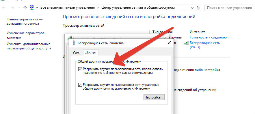 - во вкладке «Доступ» поставьте флажок, разрешающий другим сетевым устройствам использовать подключение.