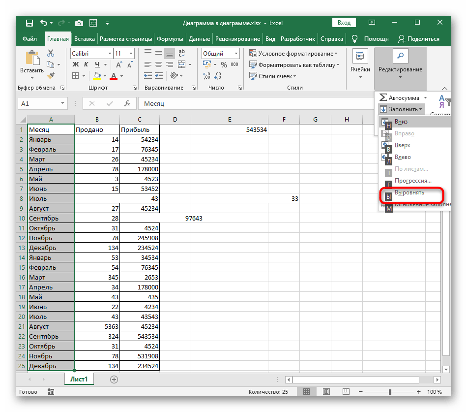 Способ 3: Действие «Заполнить»-«Выровнять»