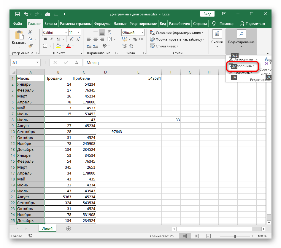 Поочередно нажмите З и А для открытия выпадающего списка «Заполнить».