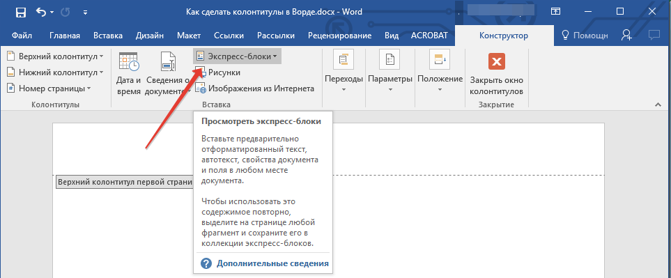 2. Перейдите на вкладку «Дизайн», расположенную в разделе «Работа с верхними и нижними колонтитулами», затем нажмите «Быстрые блоки» (группа «Вставка”).