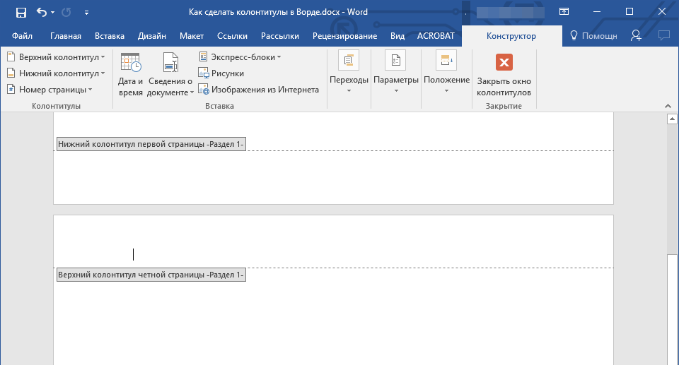 Чтобы выйти из режима редактирования, кликните по кнопке «Закрыть окно колонтитулов» или нажмите клавишу Esc. При необходимости отредактируйте аналогичным образом противоположный колонтитул.