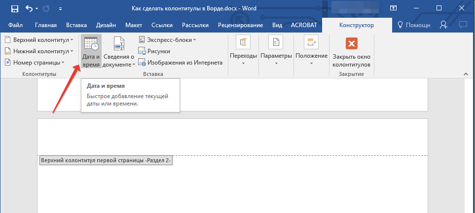 Дважды щелкнуть по нужному колонтитулу и нажать на кнопку «Дата и время».