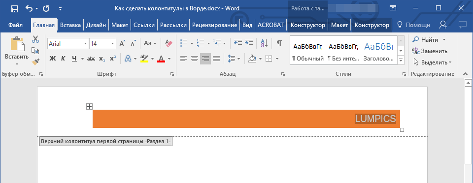 - Как изменить текст и его оформление. Содержимое колонтитула можно редактировать точно так же, как основной текст страницы — с помощью инструментов на вкладке «Главная». Если после этого вы пожелаете выполнить любые из перечисленных ниже действий, вернитесь на вкладку «Работа с колонтитулами» → «Конструктор» (или просто «Колонтитулы» в macOS).