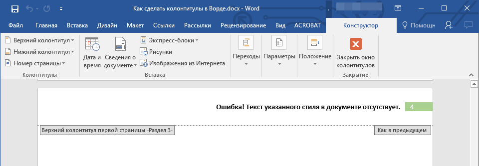 Обратите внимание, что так нужно отделить каждый раздел, то есть выделить подобным образом страницы, предназначенные для каких-то особых колонтитулов. Далее в панели «Конструктор», группе «Переходы» дезактивируем кнопку «Как в предыдущем», если она была нажата (см
