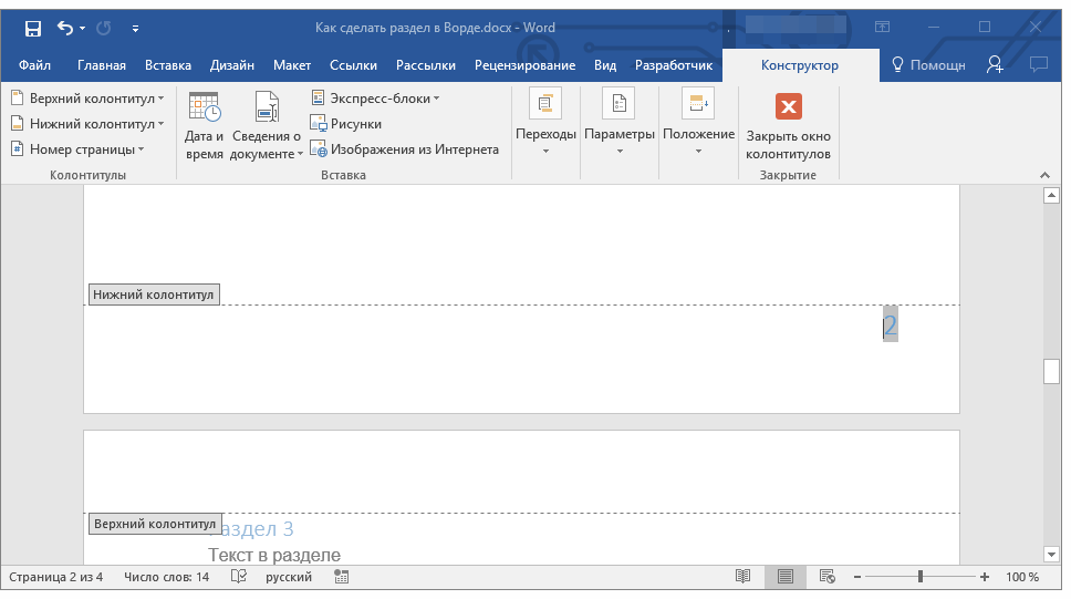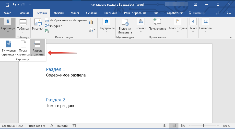 Вставка разрыва раздела