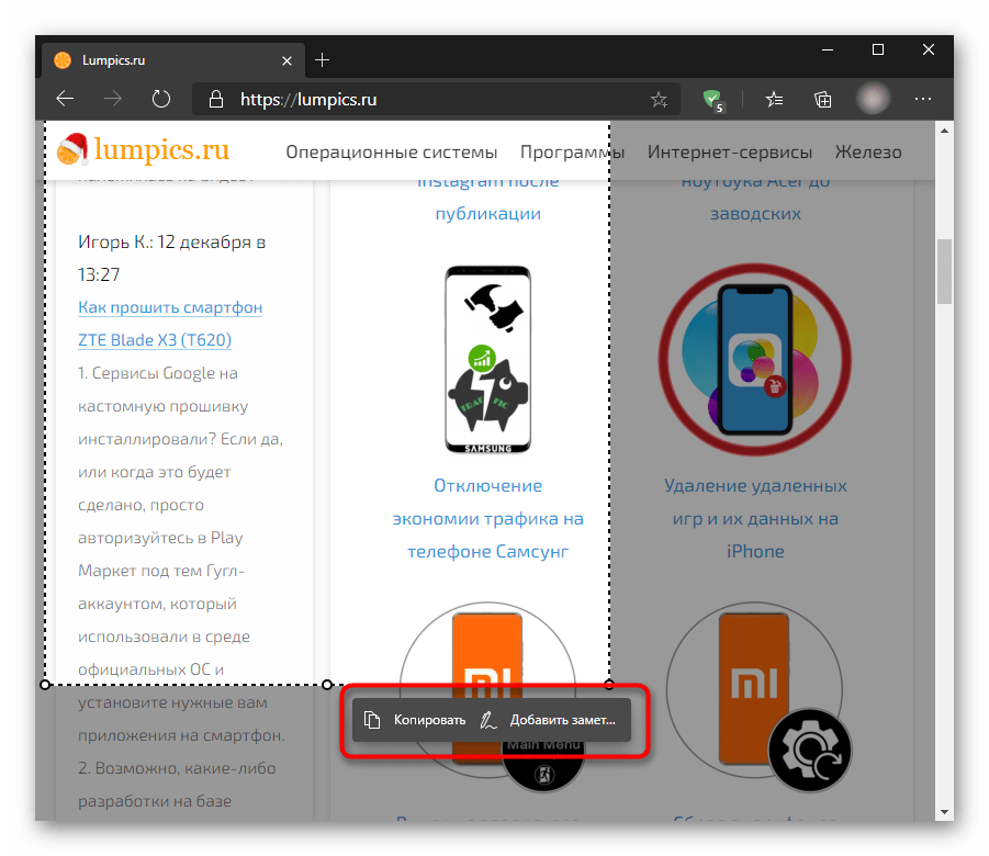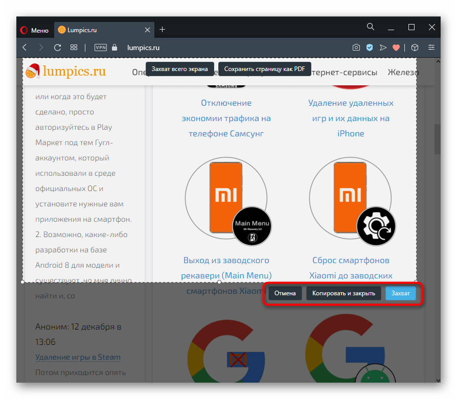 При выборе участка позволяется прокручивать страницу вниз, тем самым создавая длинный скриншот. Как только область будет взята в фокус, нажмите на «Копировать и закрыть», чтобы поместить скриншот в буфер обмена, или на «Захват», чтобы сохранить его в виде файла.