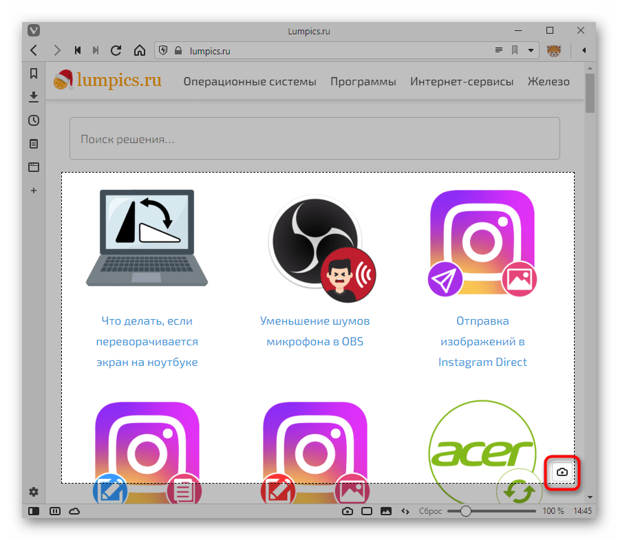 Выделите область, которую необходимо запечатлеть, и нажмите кнопку с камерой, находящуюся в углу подсвеченного участка.