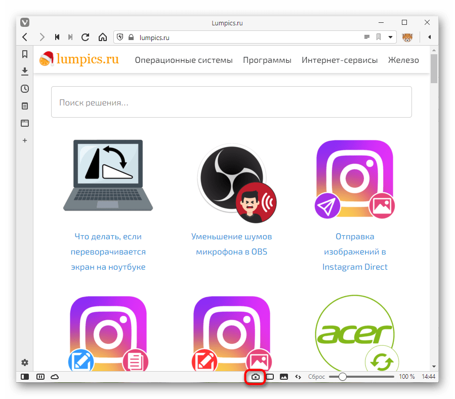 - Кнопка создания скриншота находится в нижней части окна браузера.