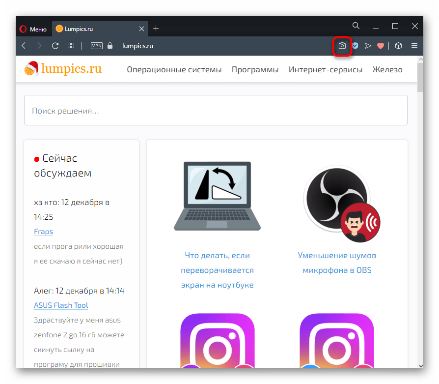 - Иконка создания снимка окна находится прямо в адресной строке — нажмите по ней.