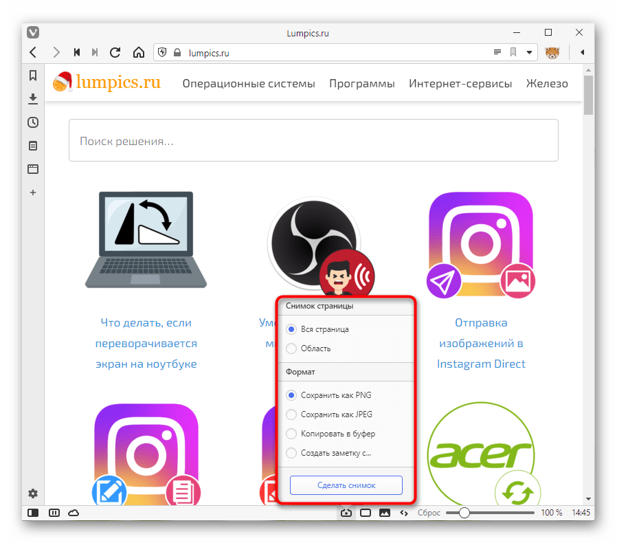 У Vivaldi — продукта бывших разработчиков Opera — инструмент создания скриншота совсем не такой. В нем отсутствуют какие-либо дополнительные функции, предназначенные для редактирования.