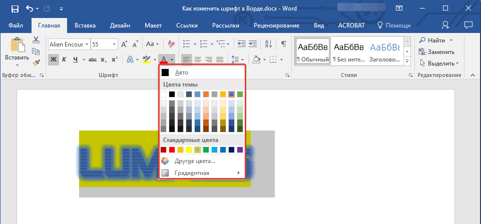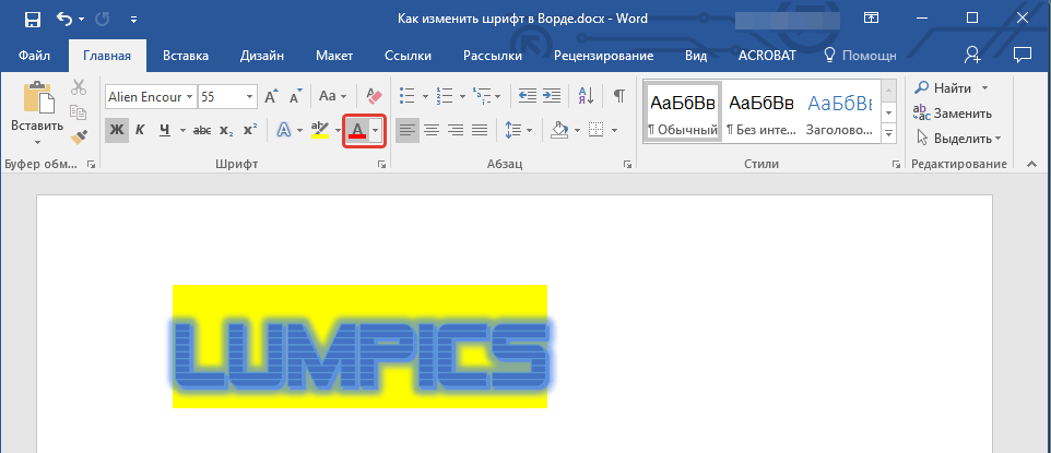 Следующая кнопка в группе “Шрифт” — “Цвет шрифта” — и, как понятно из названия, она позволяет этот самый цвет изменить.