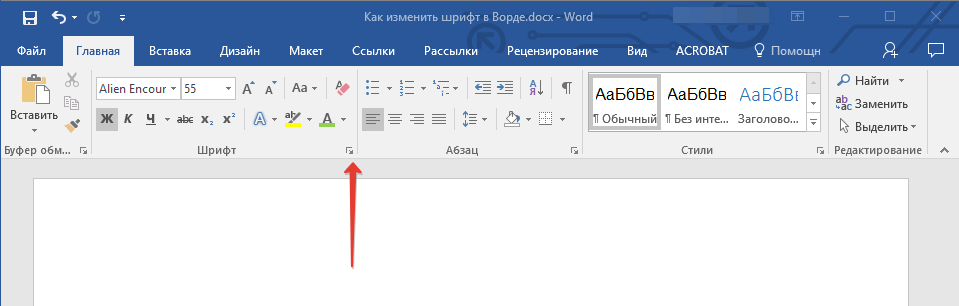 1. Откройте диалоговое окно “Шрифт”, нажав на стрелочку, расположенную в правом нижнем углу одноименной группы.