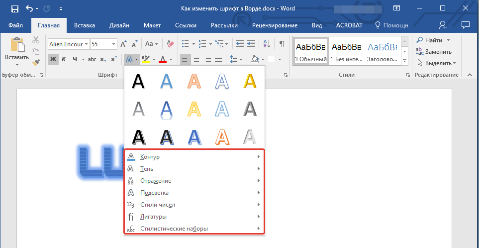 Чтобы изменить стиль шрифта, его оформление, в группе “Шрифт”, которая расположена во вкладке “Главная” (ранее “Формат” или “Разметка страницы”) нажмите на небольшой треугольник, расположенный справа от полупрозрачной буквы “А” (“Текстовые эффекты и оформление”).