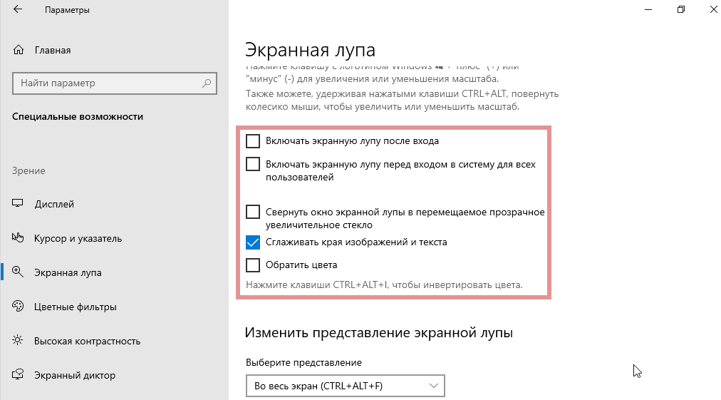 Если вы хотите изменить настройки лупы, вы можете изменить их, нажав следующие сочетания клавиш.
