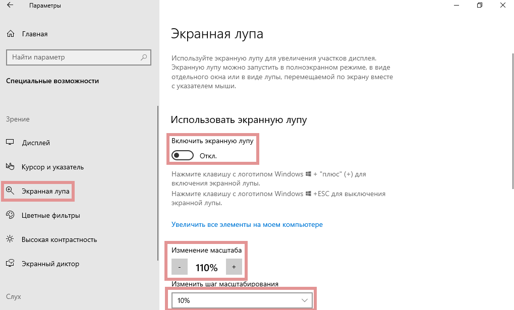 Чтобы быстро включить или отключить лупу в Windows 10, вы можете выполнить следующие действия.