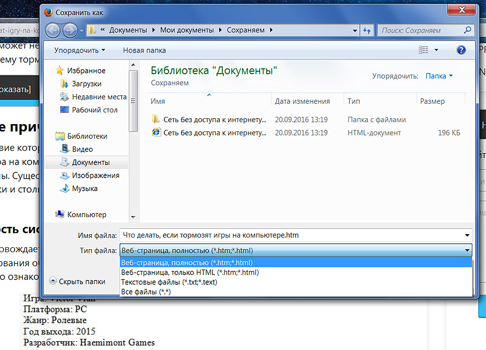 - Задайте путь и имя файла. Графика и мультимедиа будет находиться в том же месте, что и документ. К примеру, если вы сохраните на компьютер страницу под названием «nastroyvse», то её наполнение будет добавлено в папку «nastroyvse». Но всё отобразиться так, как в браузере.
