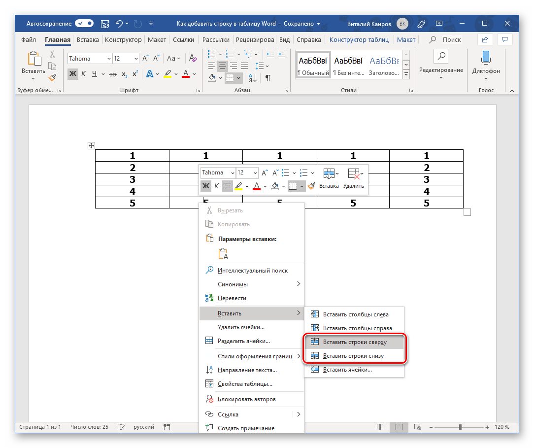 Возможно, вы обратили внимание на то, что вызываемое нажатием ПКМ меню содержит не только привычный список опций, но и дополнительную мини-панель, в которой представлены некоторые инструменты из ленты. Нажав на расположенную на ней кнопку «Вставка», вы откроете подменю, из которого можно добавить новую строку — за это отвечают опции «Вставить сверху» и «Вставить снизу»