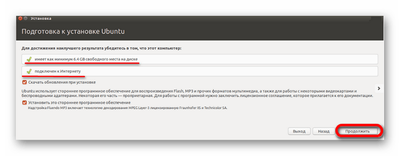 Далее будет отображена оценка свободного пространства. Вы можете отметить пункт напротив «Скачать обновления при установке». Также отметьте «Установить это стороннее программное…», если не хотите тратить время на поиски и загрузку необходимого ПО. В конце подтвердите всё, нажав «Продолжить».