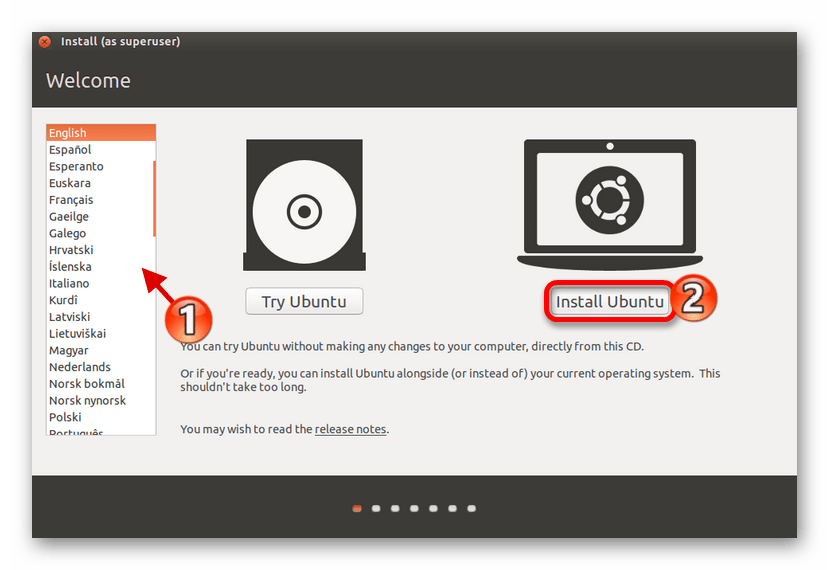 - Выставьте нужный язык и щелкните «Install Ubuntu» («Установка Ubuntu»).