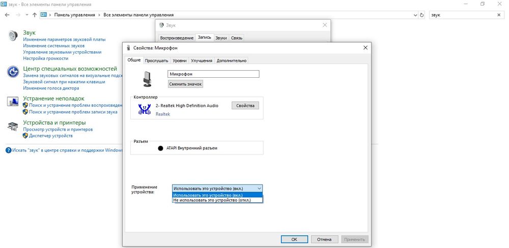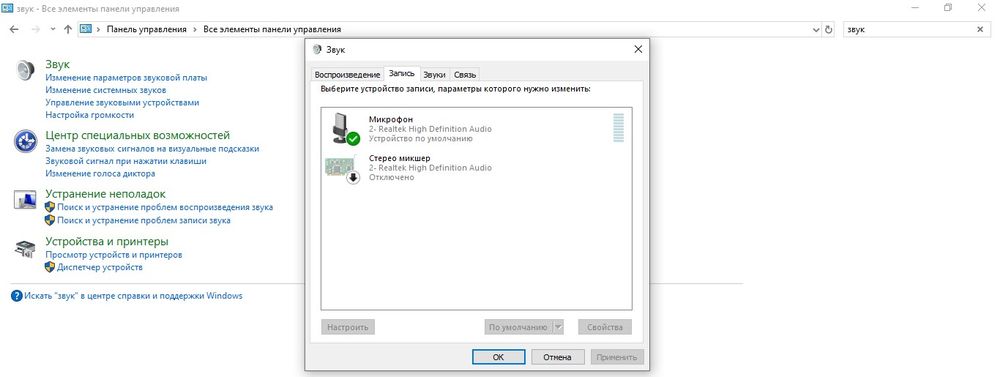 Прежде чем приступать непосредственно к решению проблемы, когда не работает микрофон Windows 10, рекомендуется проверить, установлен ли он по умолчанию в качестве основного устройства.