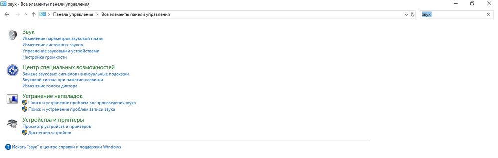 - Откроется Панель управления, где в поисковую строку (вверху справа) ввести слово «звук» без кавычек, на экране отобразится результат поиска.