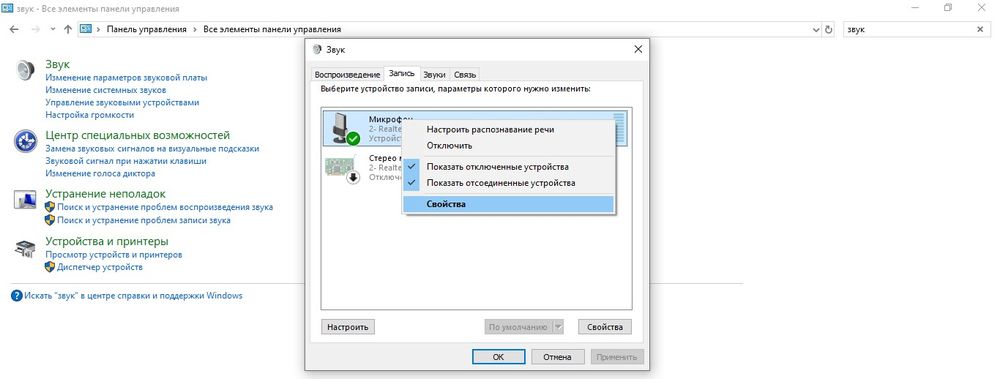 Откроется новое окно с надписью «Звук». На вкладках в верхней части окна щелкните Запись. Здесь вы увидите микрофоны, подключенные к ПК. Выделите то, что вы используете, и нажмите «Свойства».