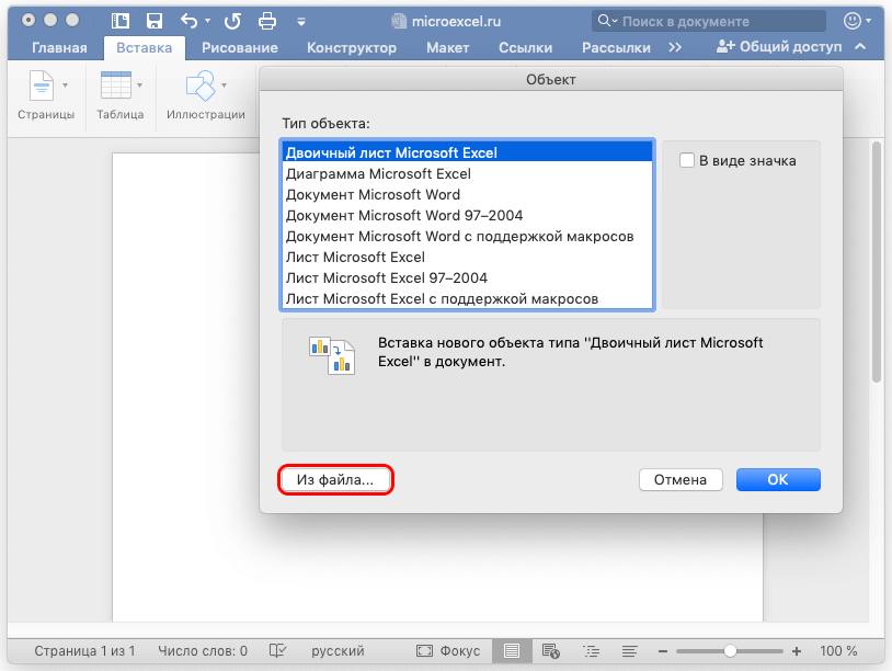 Перед вами откроется «Мастер вставки объектов». В нем перейдите на вкладку «Создать из файла». Нажмите кнопку «Обзор» и выберите файл Excel в соответствующей папке (в которой вы его ранее сохранили.