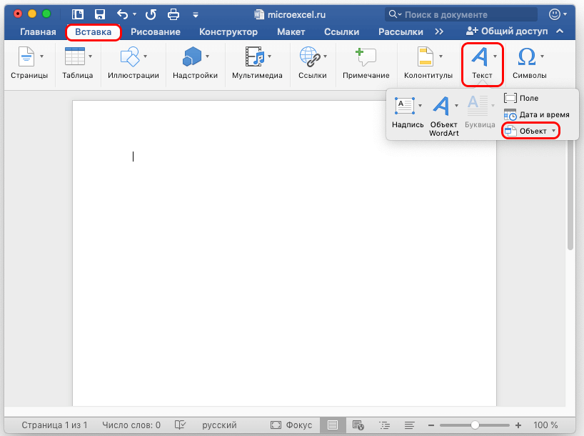 Откройте документ Word, в который хотите перенести таблицу. Перейдите на вкладку «Вставка», где в блоке «Текст» нажмите на инструмент «Объект».