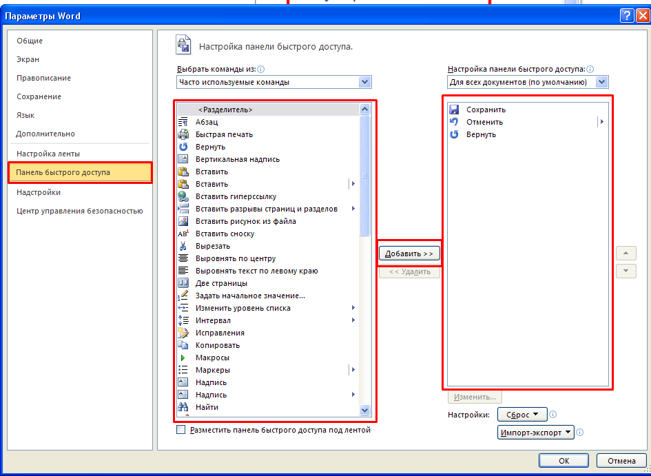 Над главной лентой есть отдельный блок быстрого доступа. Его также можно настроить через Параметры ворд.