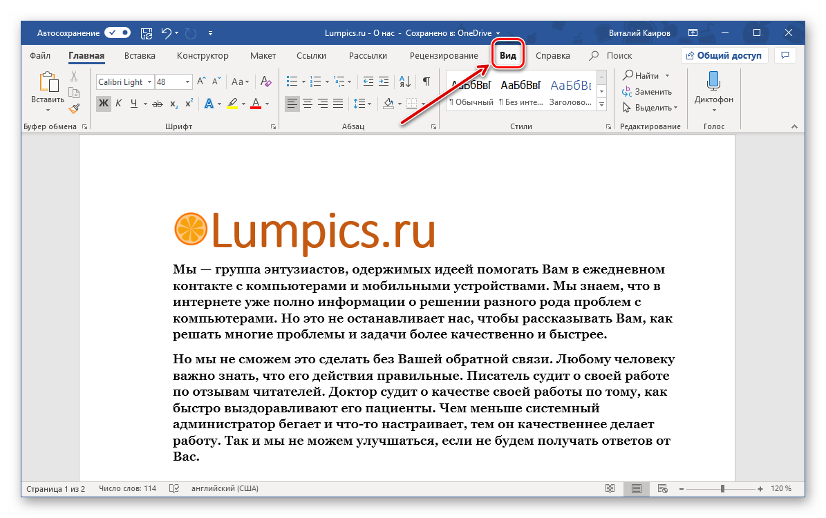- В текстовом документе Ворд перейдите во вкладку «Вид».