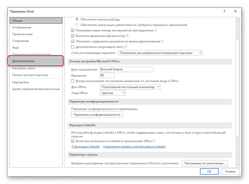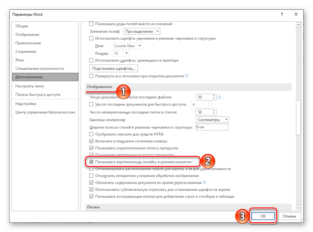 В отобразившемся диалоговом окне перейдите во вкладку «Дополнительно». Пролистайте перечень доступных в данном разделе опций до блока «Отображение» (ранее он назывался «Экран») и установите галочку напротив пункта «Показывать вертикальную линейку в режиме разметки». Для подтверждения внесенных изменений нажмите «ОК».