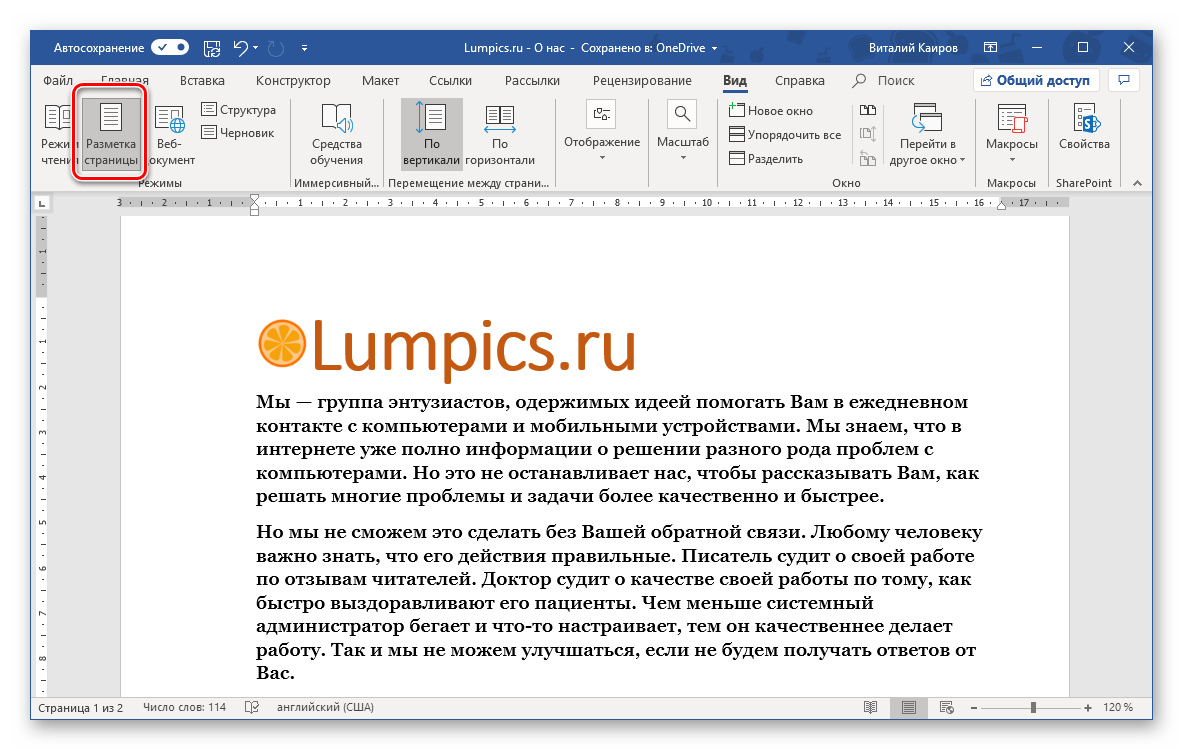 «Разметка страницы» — отображаются обе линейки;