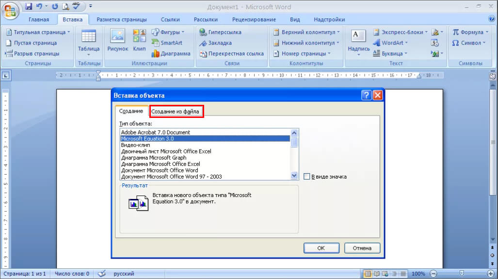 Итак, делаем всё по инструкции. Запускаем Майкрософт офис 2007 или другую версию. Далее, нажимаем вверху панели управления Ворда «Вставка» и «Объект» (Скрин 1).