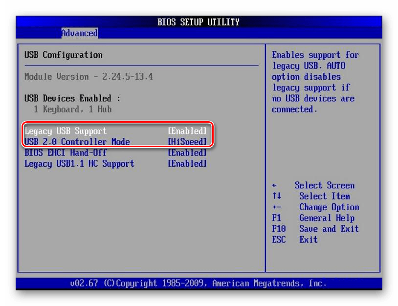 найти пункт «Поддержка USB» и присвоить ему параметр «Полная инициализация»;