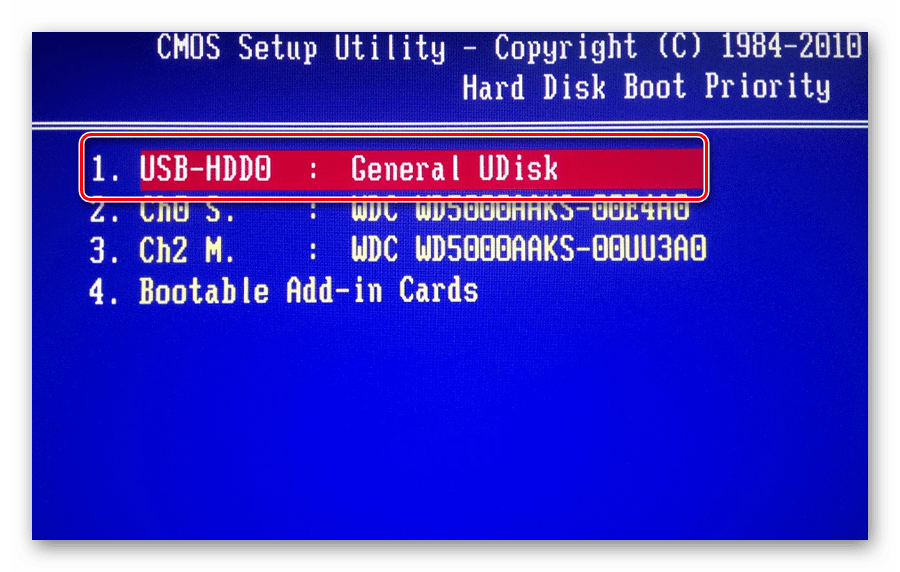 С помощью соответствующих кнопок выставьте подключенную флешку в самый верх списка. Обычно USB-устройства подписываются как «USB-HDD», а напротив указывается имя носителя.