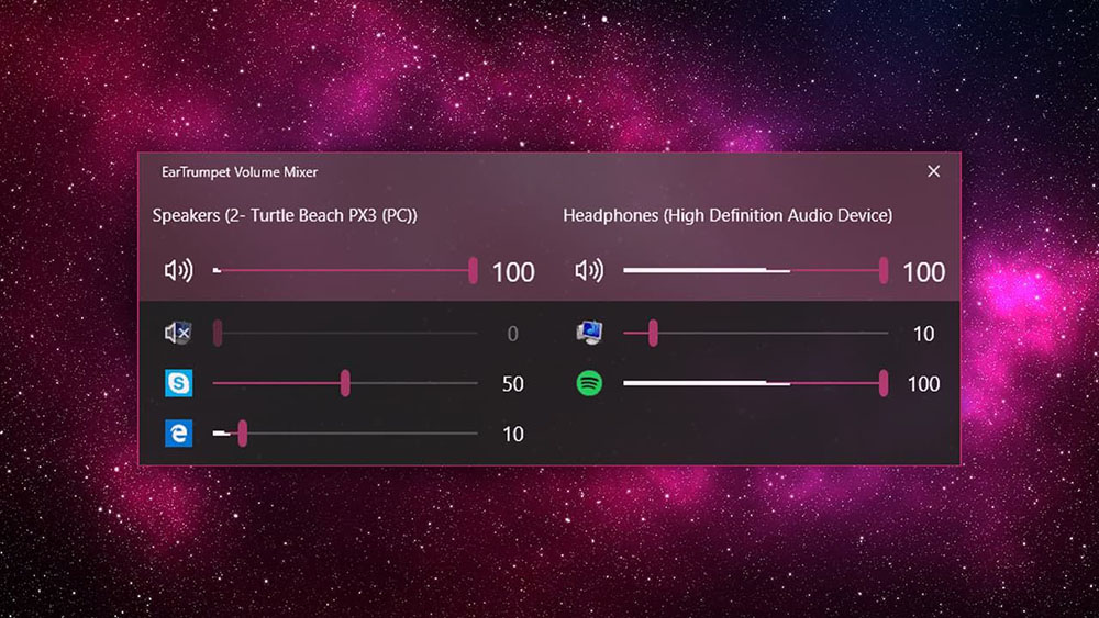 Можно управлять звуком с помощью стандартных системных настроек, а также специального софта. Например, приложение EarTrumpet позволяет выбрать источник непосредственно в системном трее или углубиться в настройки и запустить микшер, где устанавливается громкость для отдельных источников.