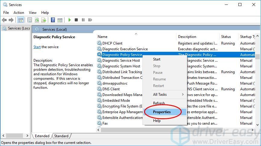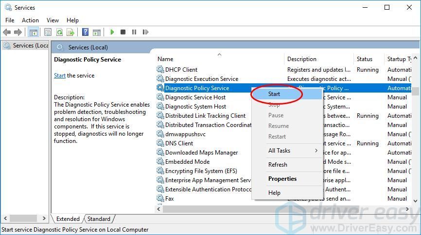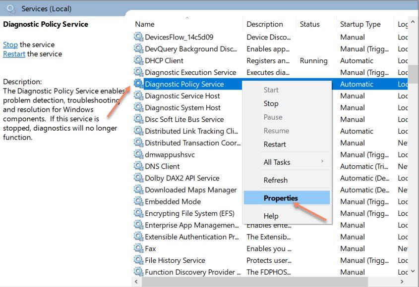 - Прокрутите вниз и щелкните правой кнопкой мыши «Служба диагностической политики».