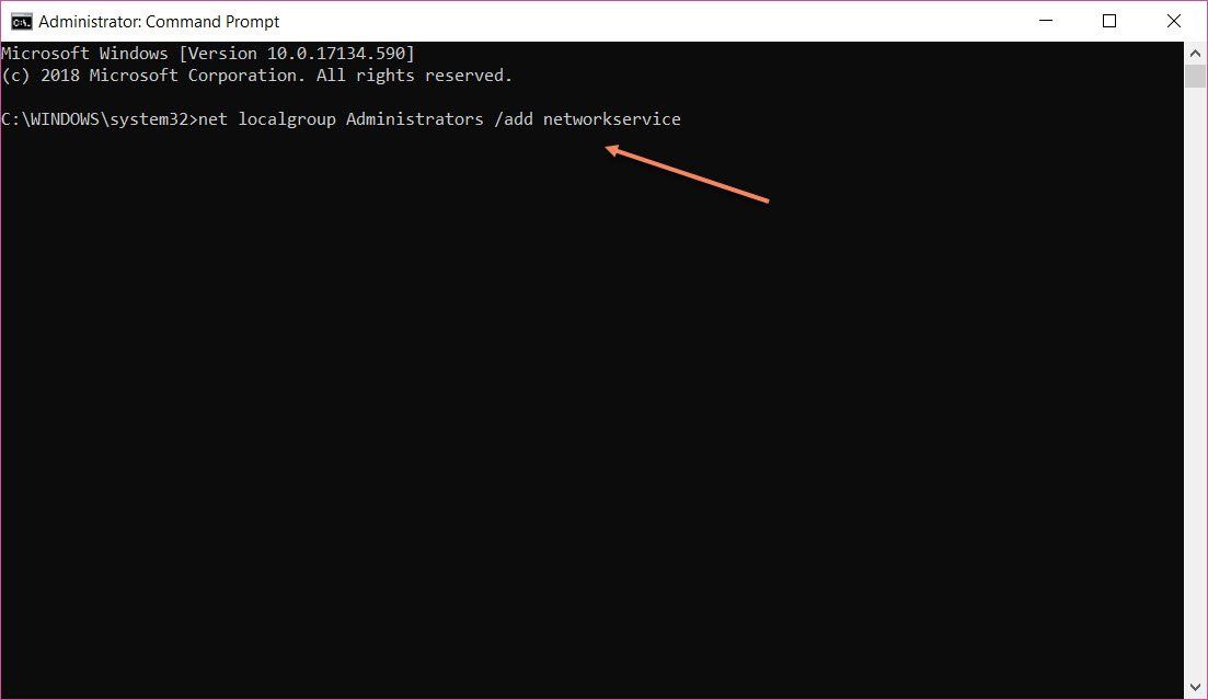 Теперь введите «net localgroup Administrators / add networkservice»