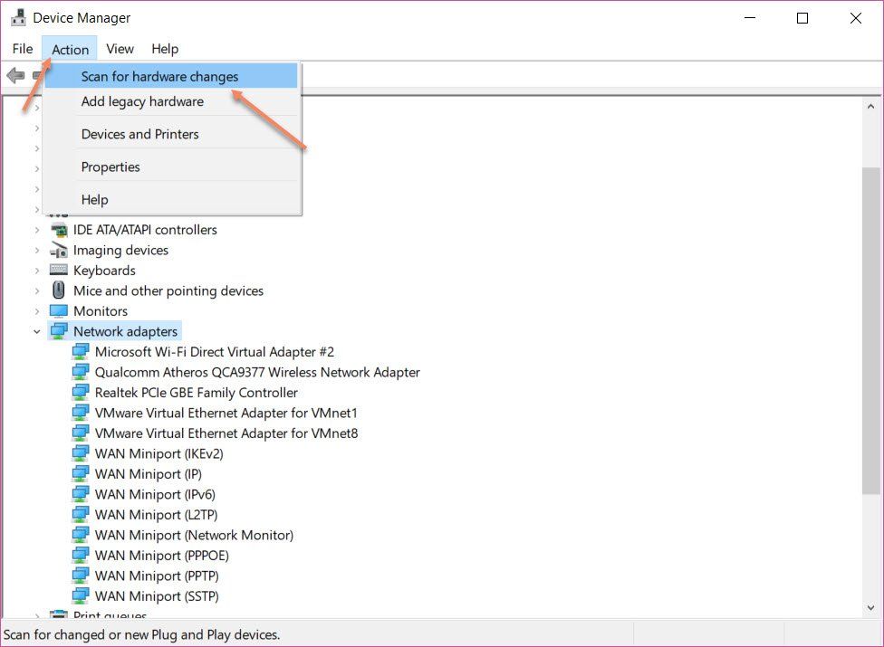 4) Нажмите Действие > Сканировать на предмет изменений оборудования . Затем Microsoft должна автоматически перезагрузить драйвер сетевого адаптера.