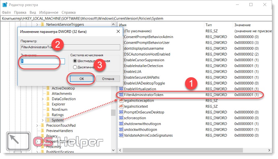 - В правой части экрана найдите параметр «FilterAdministratorToken». Если такого нет, то просто создайте его (для этого кликните правой кнопкой мыши и нажмите «Создать строковый параметр»). Для него установите значение «1».