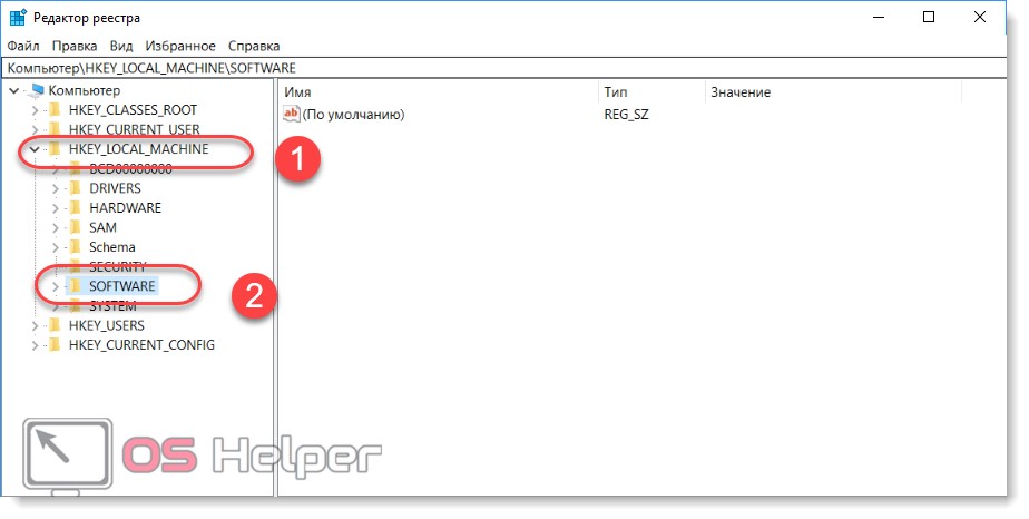 - В левой части экрана найдите и выберите папку «HKEY_LOCAL_MACHINE» (локальные параметры). Появится несколько подгрупп – кликните по «Software» (программное обеспечение).