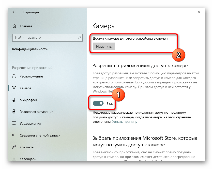 - Первая кнопка «Изменить», расположенная вверху, позволяет вовсе отключить веб-камеру, чтобы компьютер или ноутбук не мог ее использовать. Второй переключатель отвечает за общий доступ к девайсу для всех приложений.